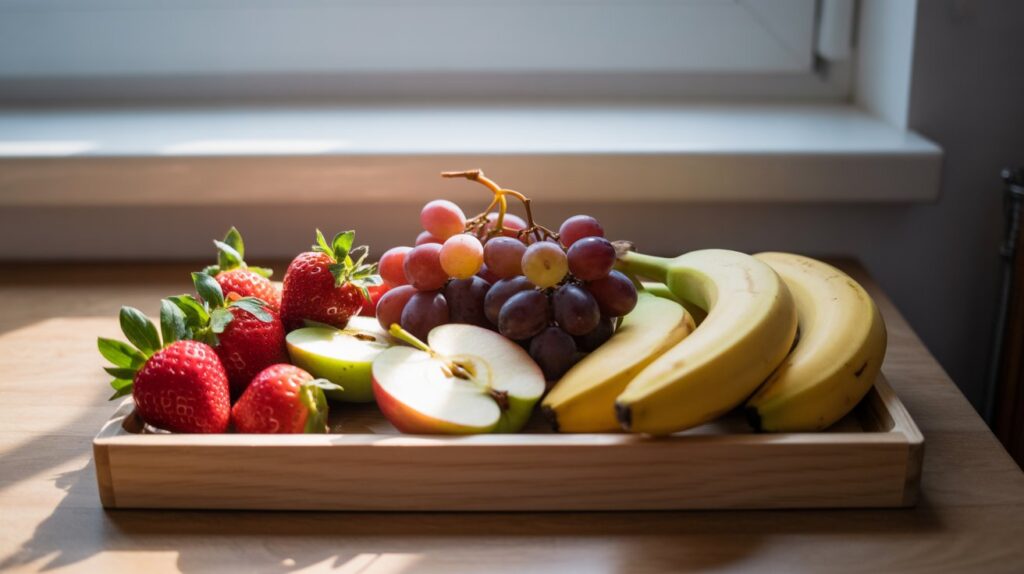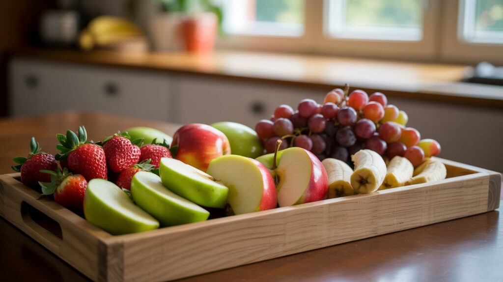 This one always disappears fast. A tray with cut fruit grapes, apple slices, strawberries, maybe a banana or two. No shapes, no faces, no effort to make it cute.
