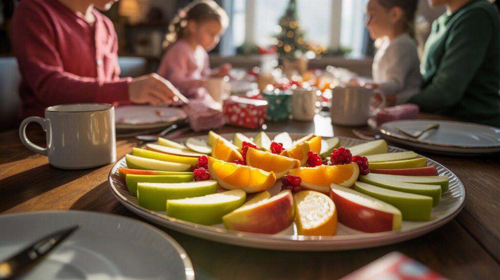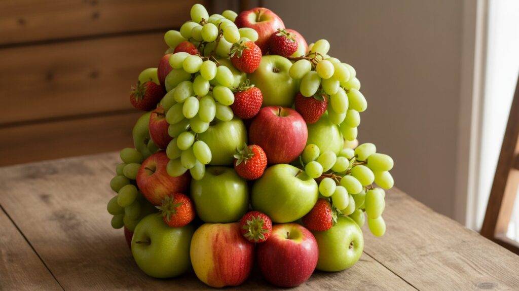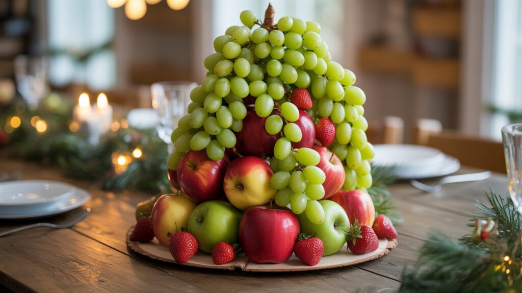 This one’s a bit playful, but still feels right for Christmas. A small fruit tree nothing overdone. Green grapes, a few apples, maybe some strawberries if you have them. Shaped loosely like a tree, not perfectly.