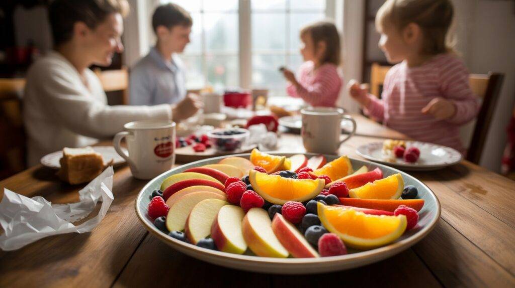 What I love about this setup is that it doesn’t stay perfect. People grab fruit as they walk by. Kids peel oranges at the table. It changes every day, and that makes it feel real.