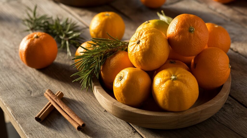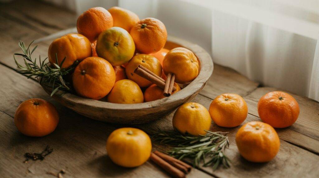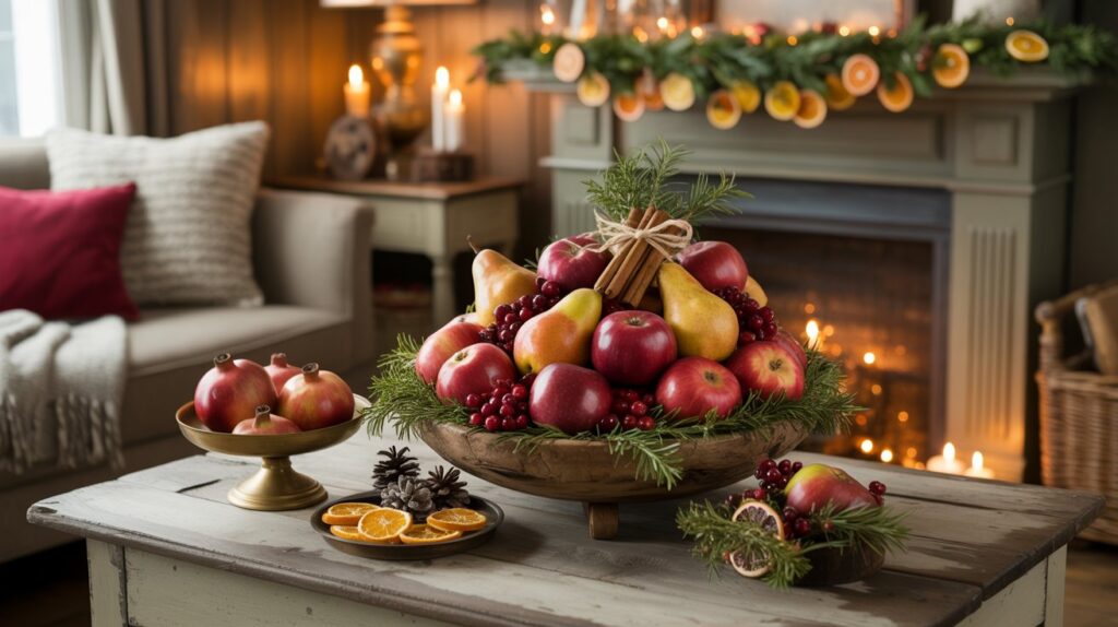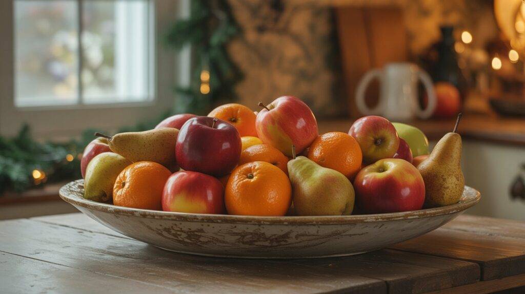 I like using a wooden bowl or even just a tray. Nothing fancy. Let the fruit stack naturally instead of lining it up. Tuck in a few rosemary sprigs if you have them, or a bit of pine from outside. Sometimes I’ll drop in a couple of cinnamon sticks not to decorate, just because they smell like Christmas.
