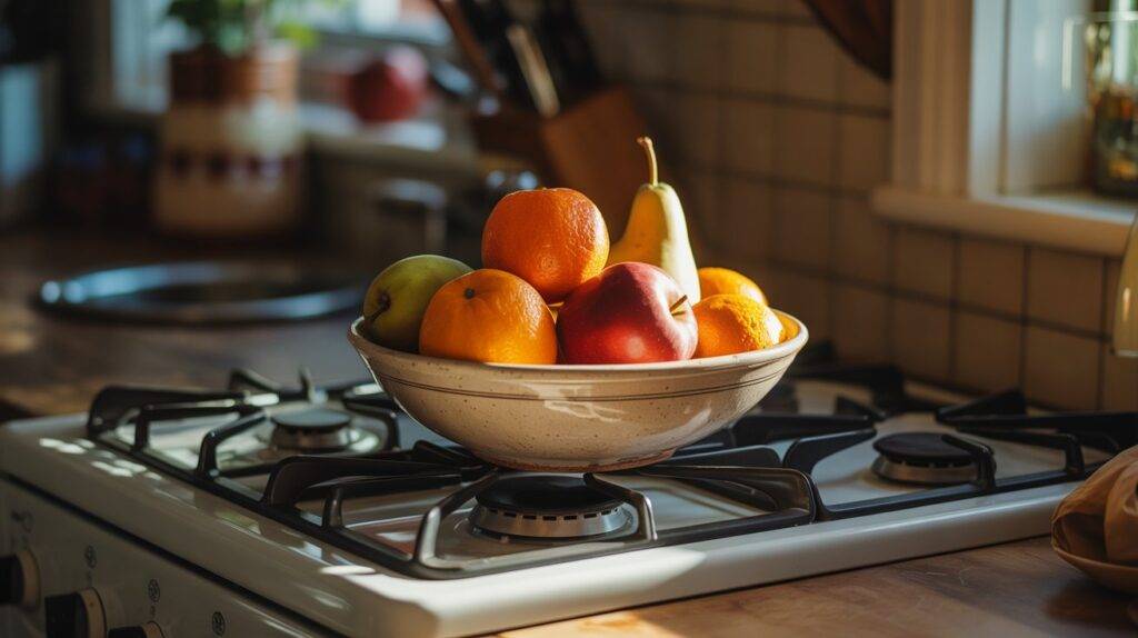 This usually happens by accident. The stove’s off, cold, and someone sets a bowl of fruit there because the counter’s already full. Oranges, apples, whatever’s around.