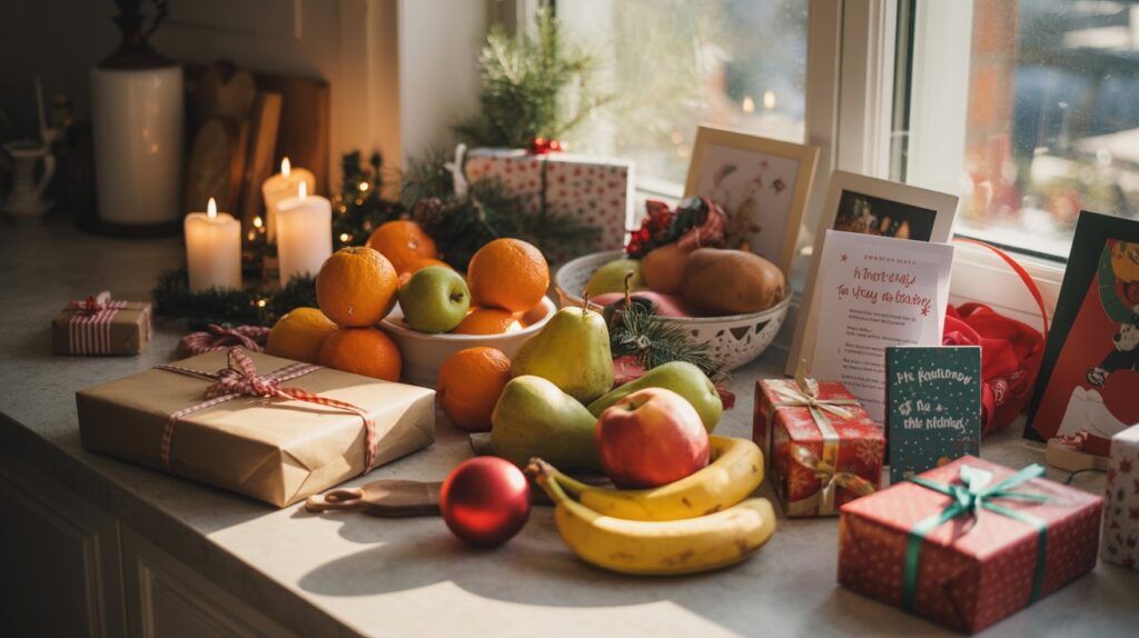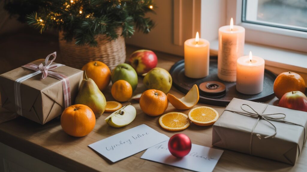 This happens without planning. Fruit ends up next to wrapped gifts, candles, cards, maybe a stray ornament.