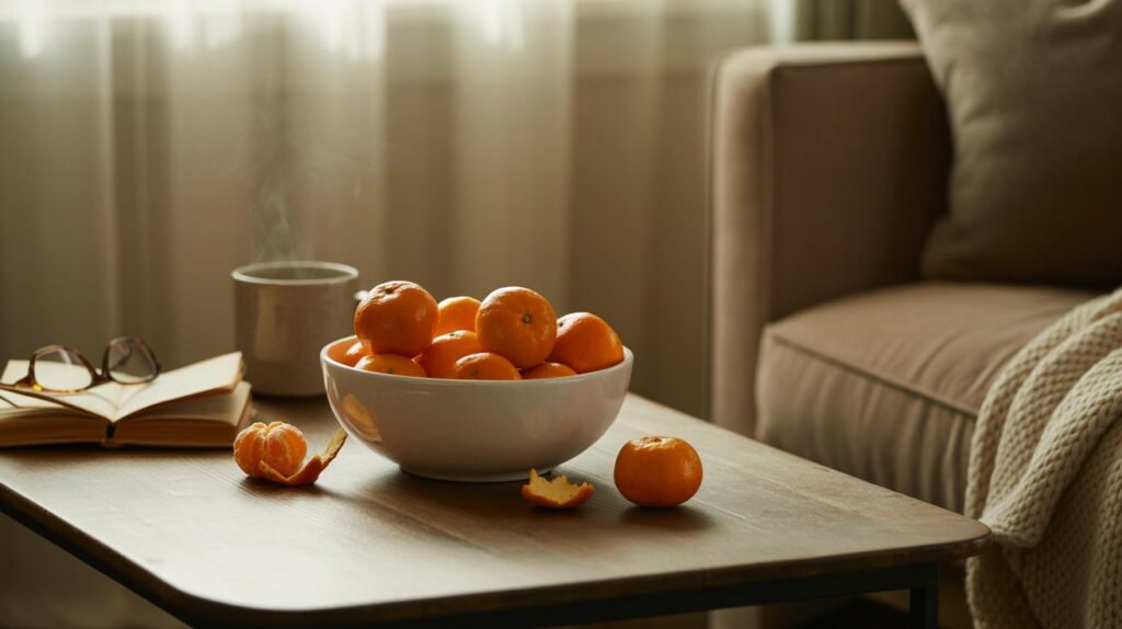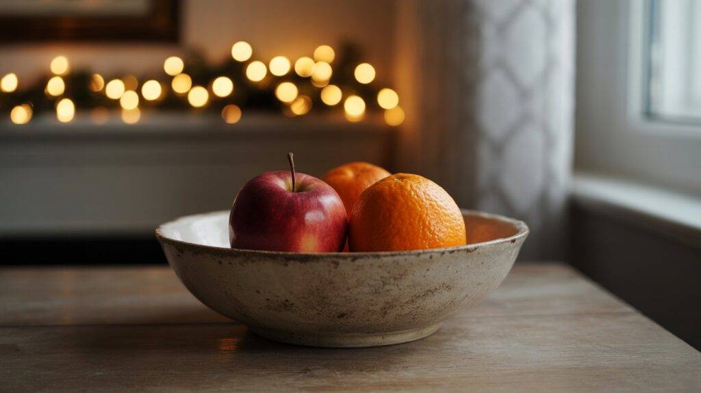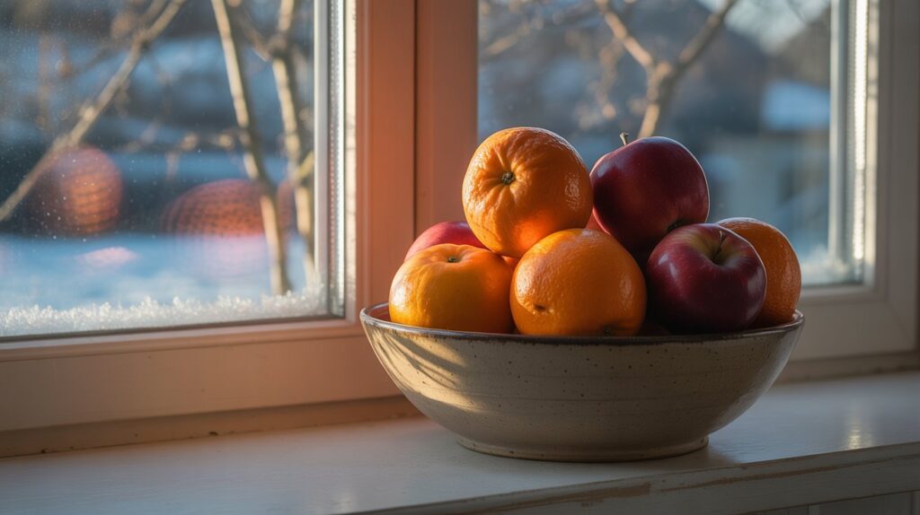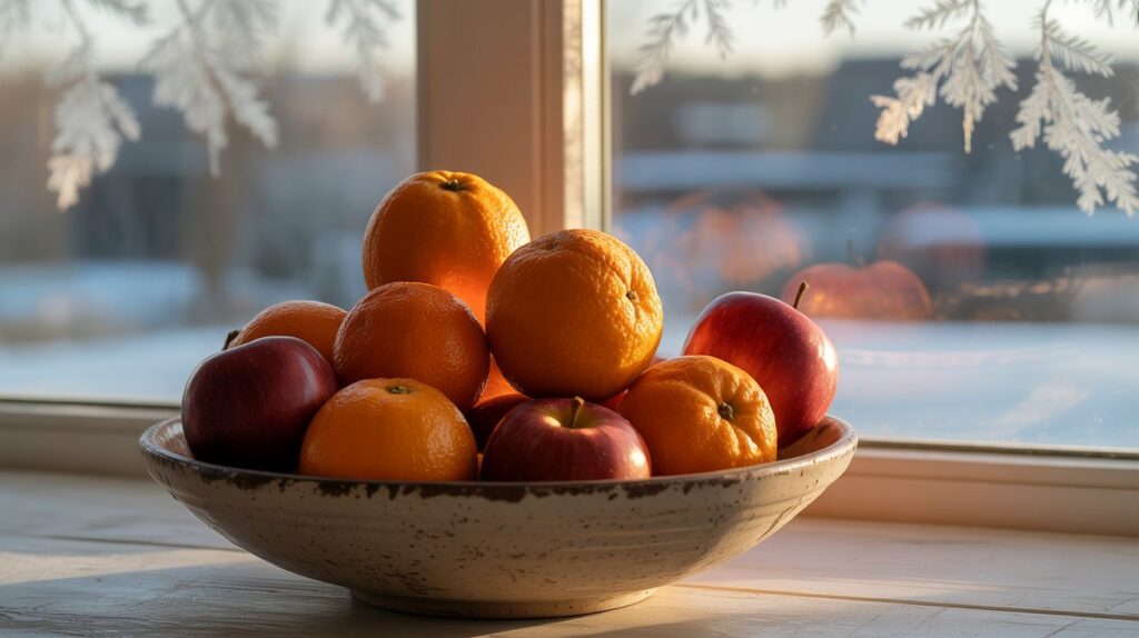 This one’s less about the fruit and more about where it is. A bowl of oranges or apples placed near a window, especially one that gets soft winter light.