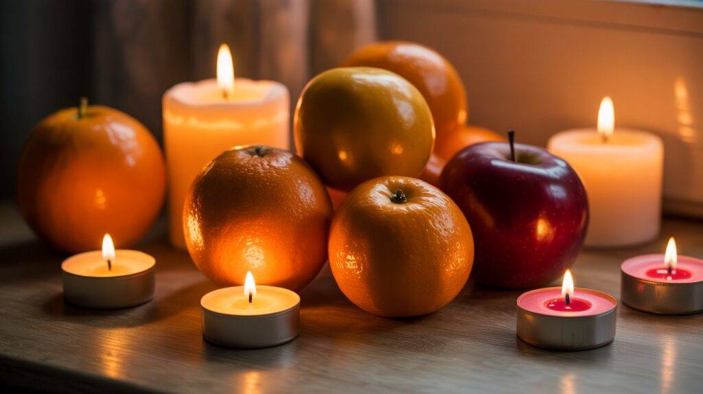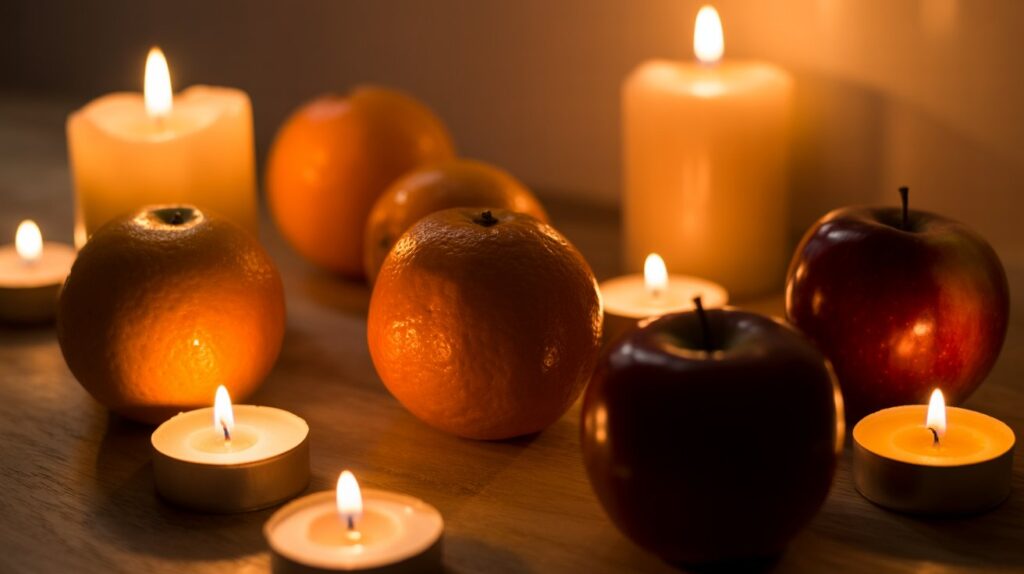 This one’s less about the fruit and more about the mood. Apples or oranges placed around candles—pillar candles, tea lights, whatever you already use.
