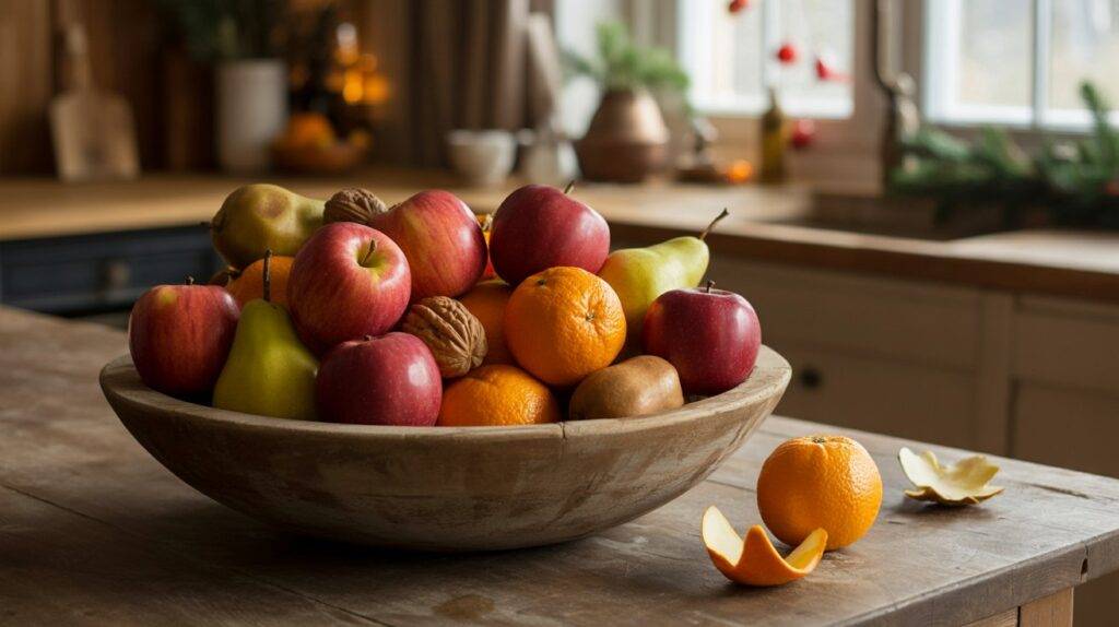 You don’t need to overthink it. A wooden bowl, a simple tray, even a large plate works. Let the fruit pile naturally. Tuck in a few rosemary sprigs or a bit of pine if you have it nearby. Sometimes I add a couple of cinnamon sticks, not for decoration exactly, but because they belong there.