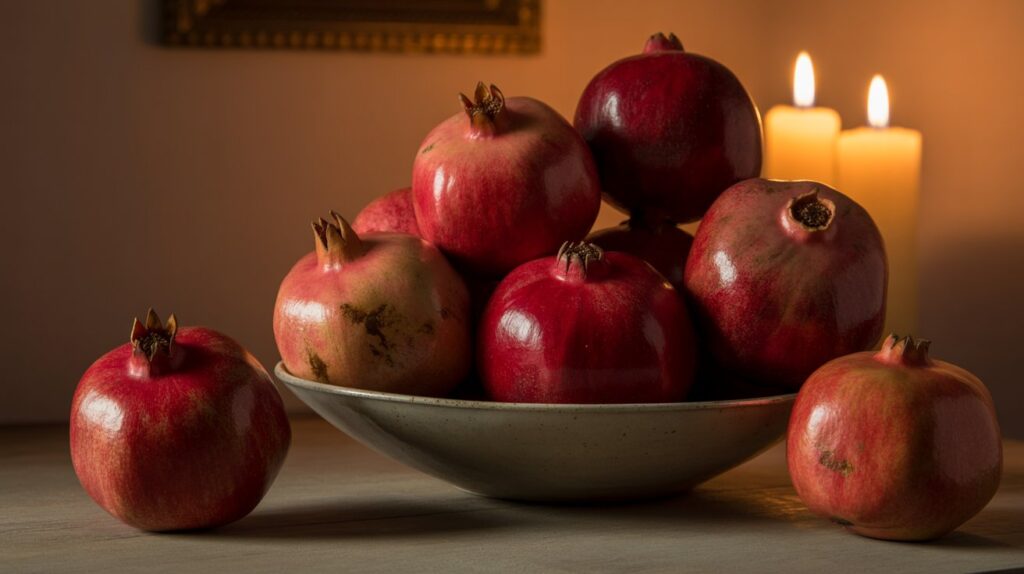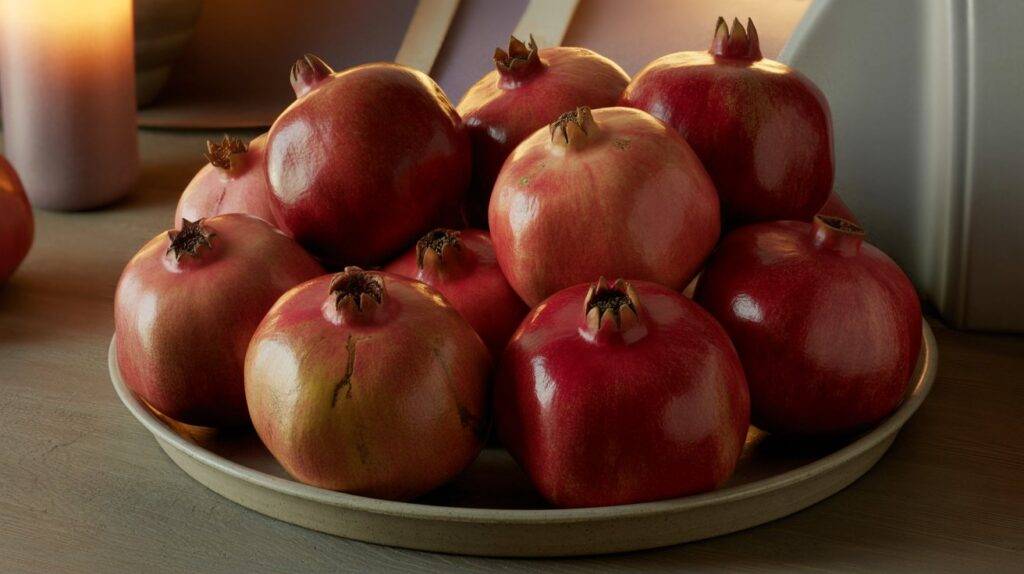 Pomegranates don’t need help. Their color alone feels like Christmas. I usually leave them whole and arrange them in a low bowl ceramic, metal, anything simple.