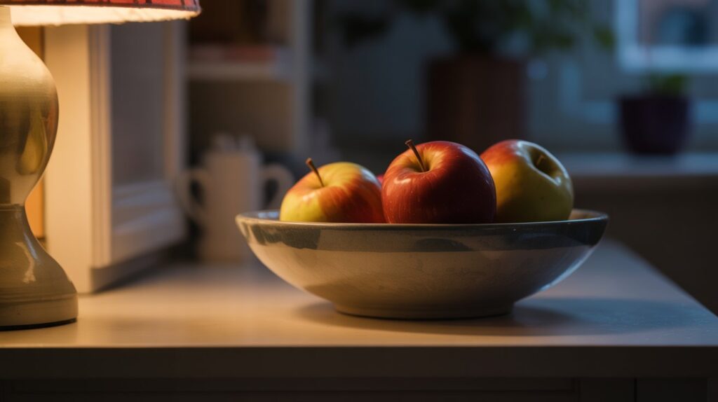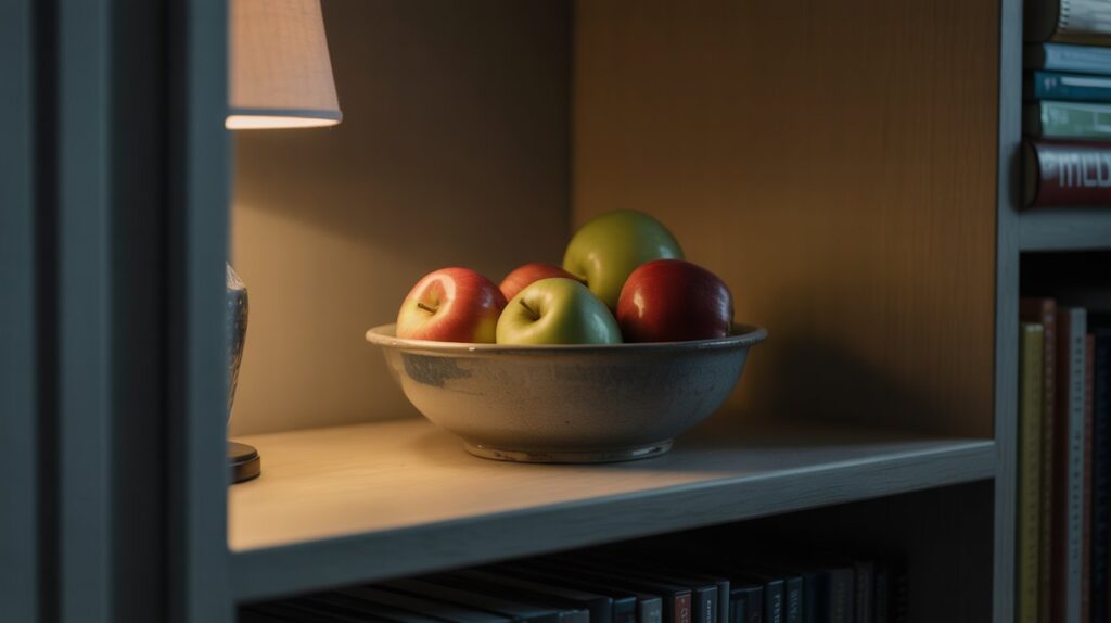 At night, when the lights are lower, it shows up again. A few apples catching light from the tree or a lamp. Quiet. Still.