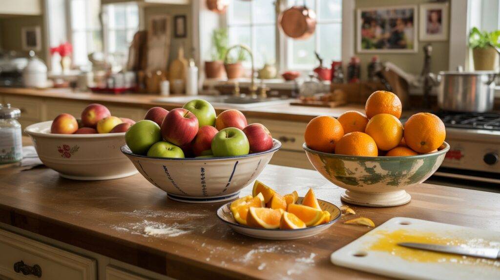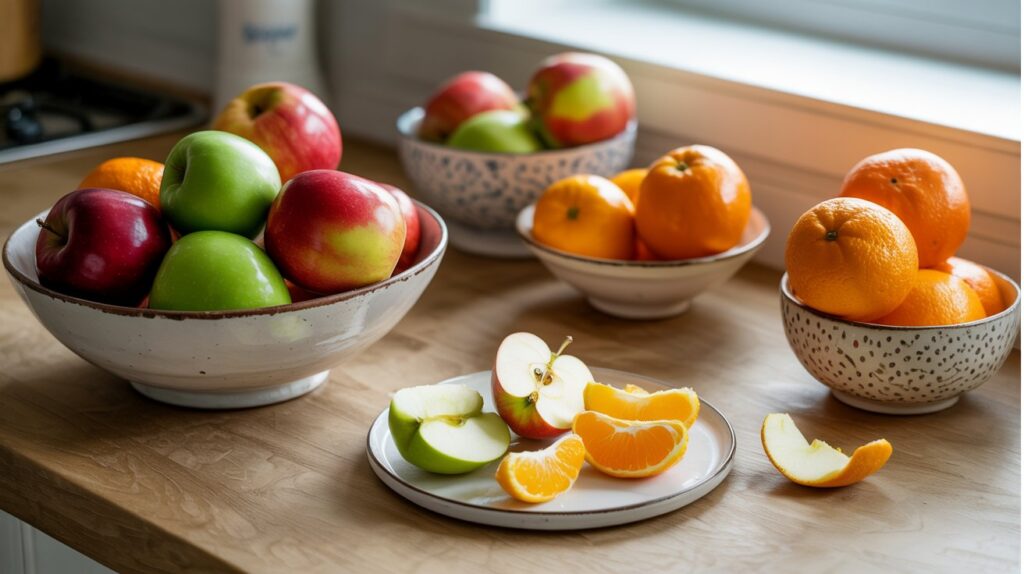 This is what happens when you stop trying to make fruit decorative and just let it be useful. A few bowls spread across the counter. One for apples. One for oranges. Maybe a small plate of cut fruit.