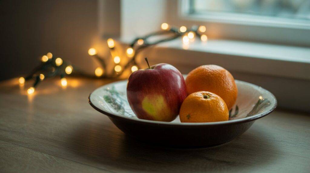 By the time Christmas winds down, most of the fruit is gone. What’s left might not look like an arrangement anymore, and that’s okay. These little setups were never about perfection or impressing anyone. They were about letting food, light, and everyday life share the same space for a while.