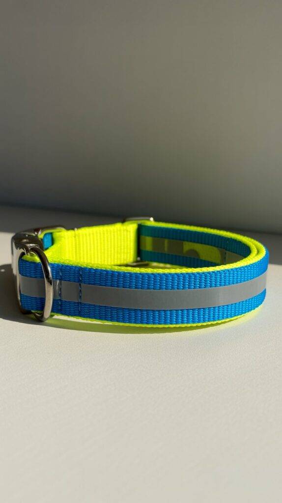 - On evening walks, reflective gear in blue or yellow works great. Dogs see those colors best even in low light.