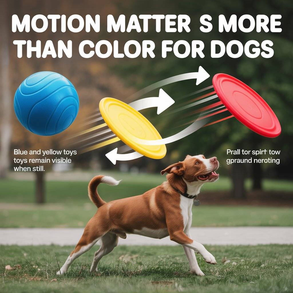 That’s why a moving red toy can still get your dog’s attention because motion overrides color. But once the toy stops moving, a red toy becomes a brown blur. A blue toy keeps some of its visibility even when still.