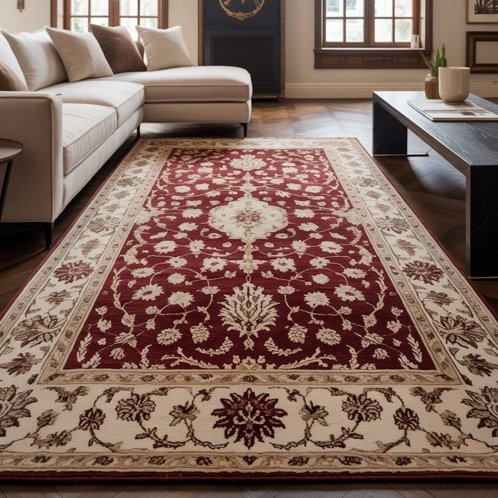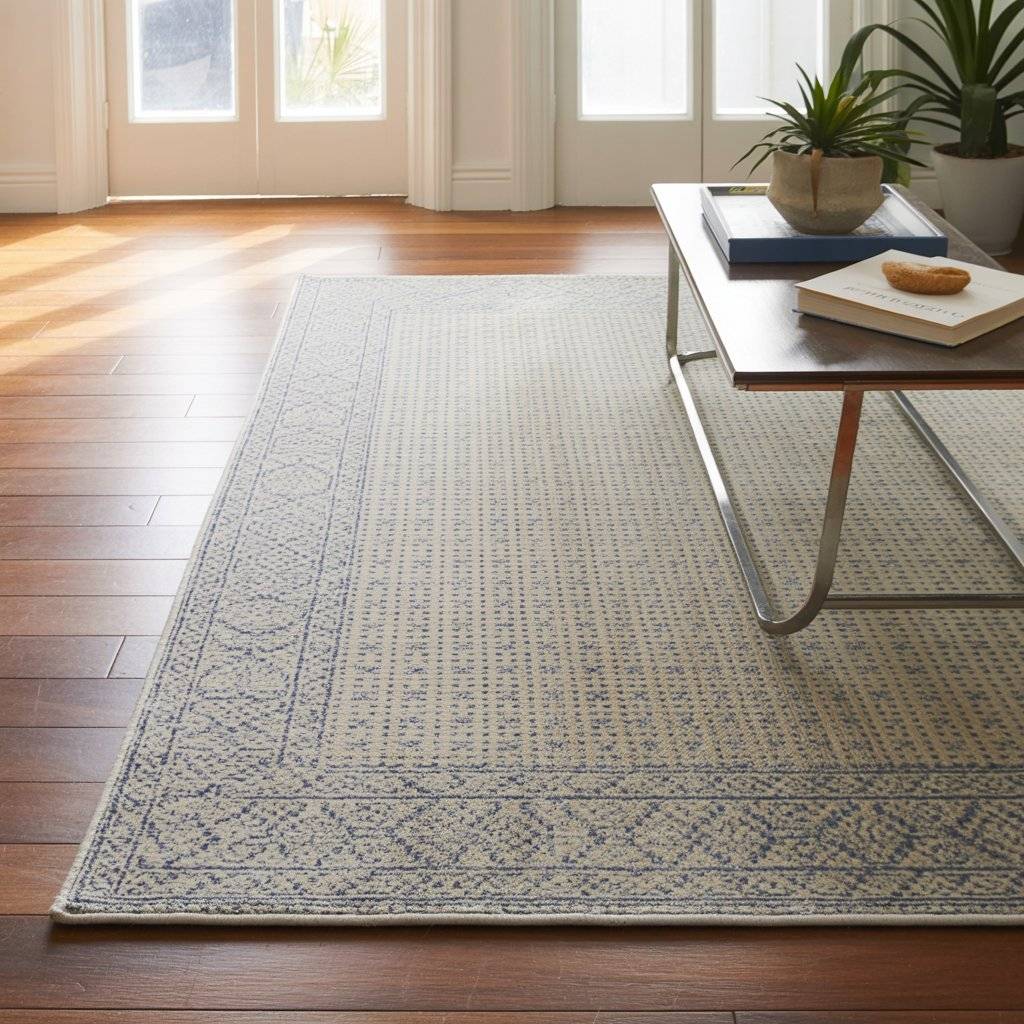 - On dark hardwood, a lighter rug creates contrast. On light tile, a darker rug anchors the room. Neutral tones like beige, gray, and ivory work with almost anything.