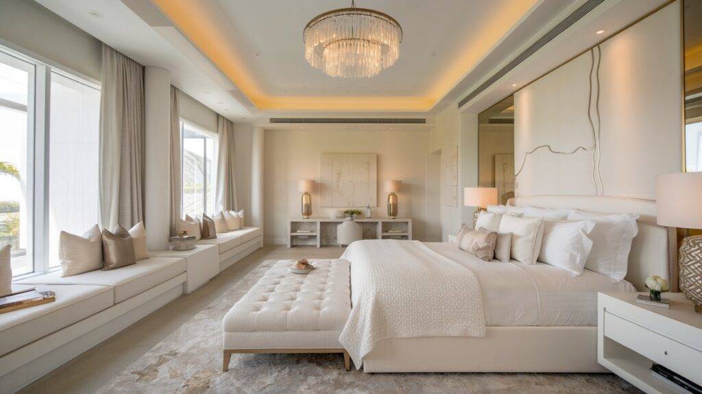 For a luxurious master bedroom, use a white palette with high-end materials and elegant details. Think plush velvet bedding, a tufted headboard, and mirrored or metallic accents.